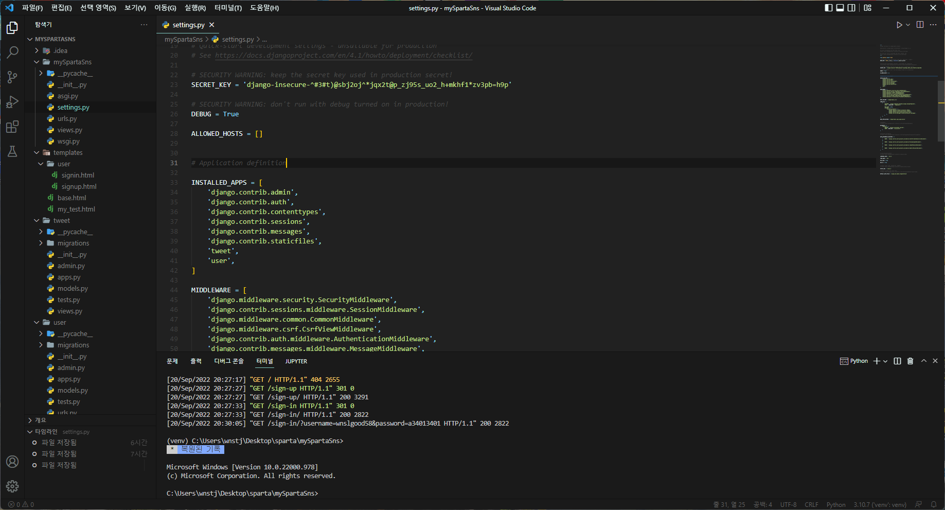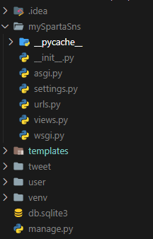 이중 INSTALLED_APPS에 우리가 만든 앱을 추가한다. (tweet, user)