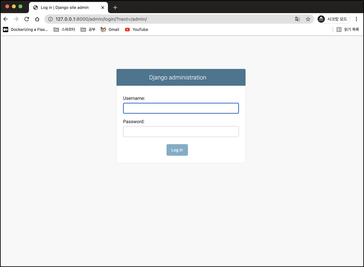 서버를 실행하고 http://127.0.0.1:8000/admin 으로 접속해보자. 아래와 같은 화면이 나올것이다.